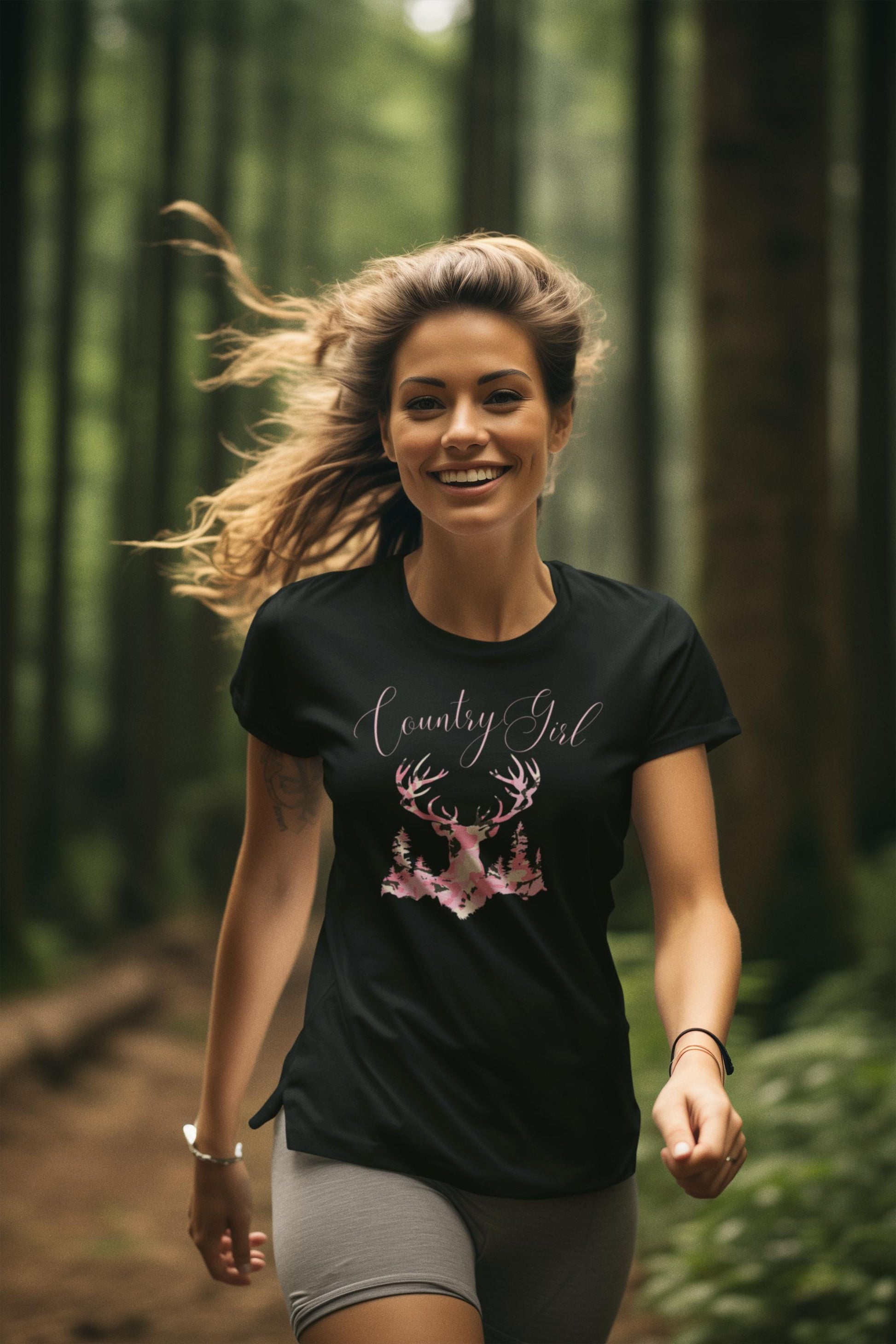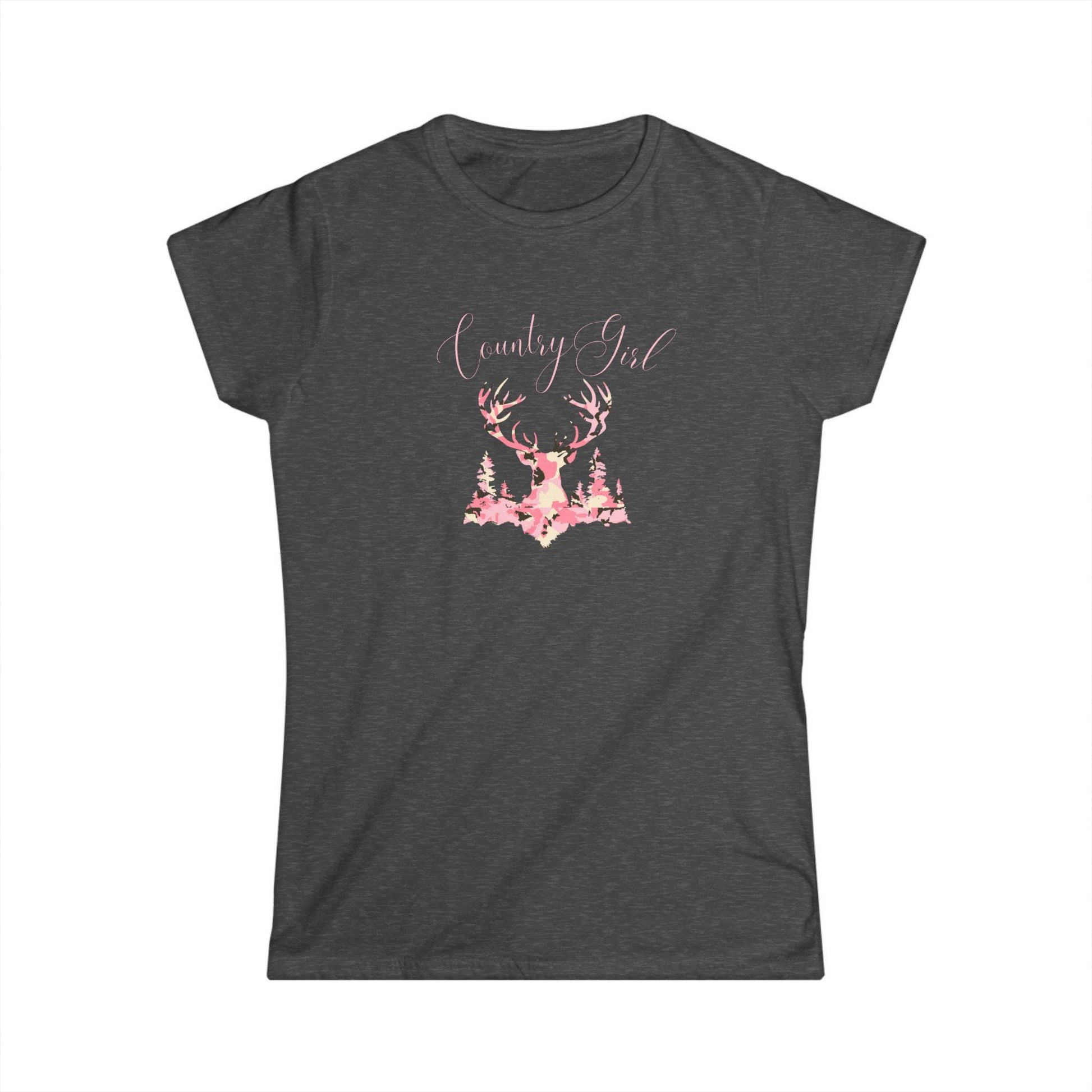 Country girl camo t-shirt with deer and woods silhouette, perfect for outdoor enthusiasts and nature lovers. Adds a touch of rustic charm to everyday wear. Ideal for those who enjoy hunting, camping, or simply appreciate the great outdoors. Suitable for country-themed events and casual occasions.