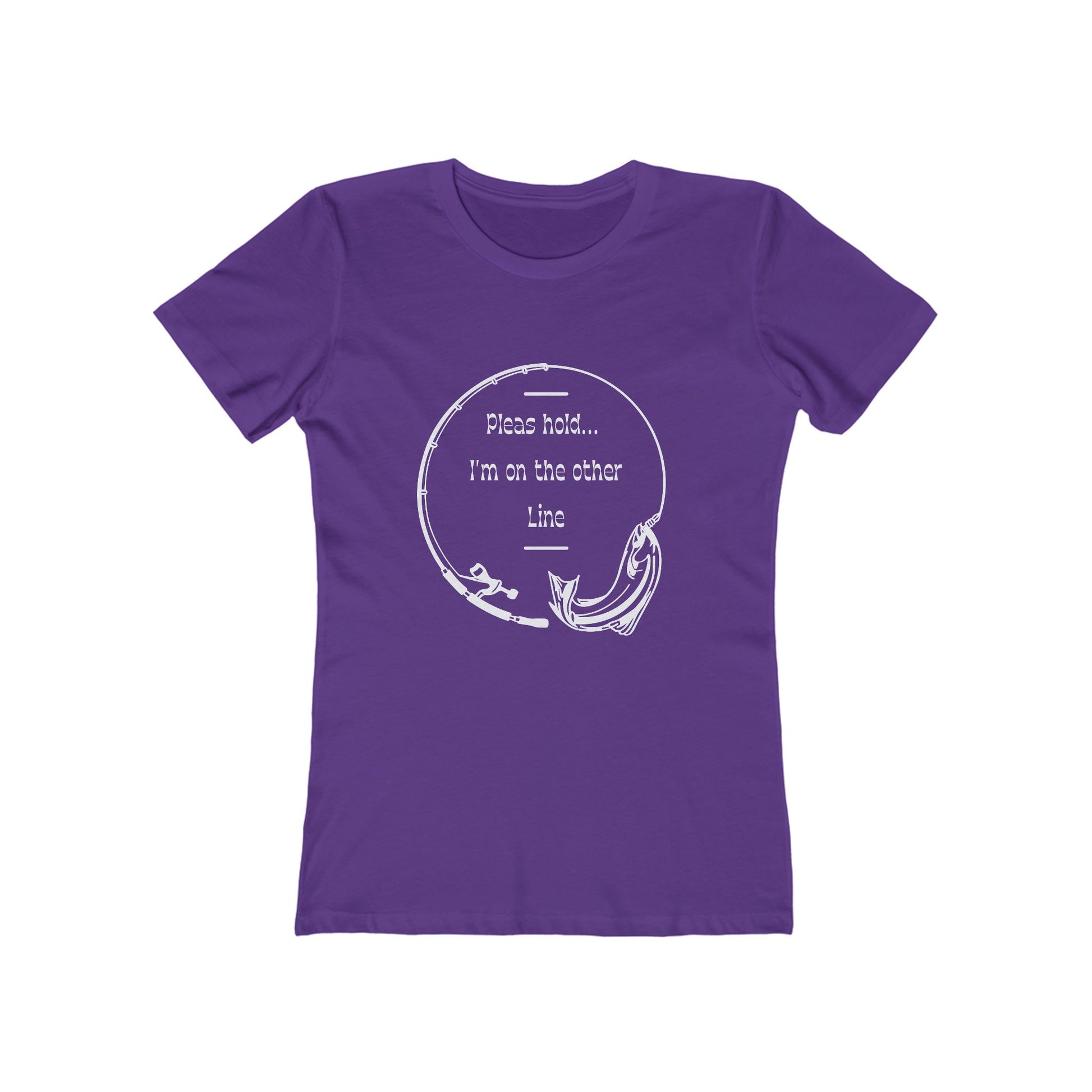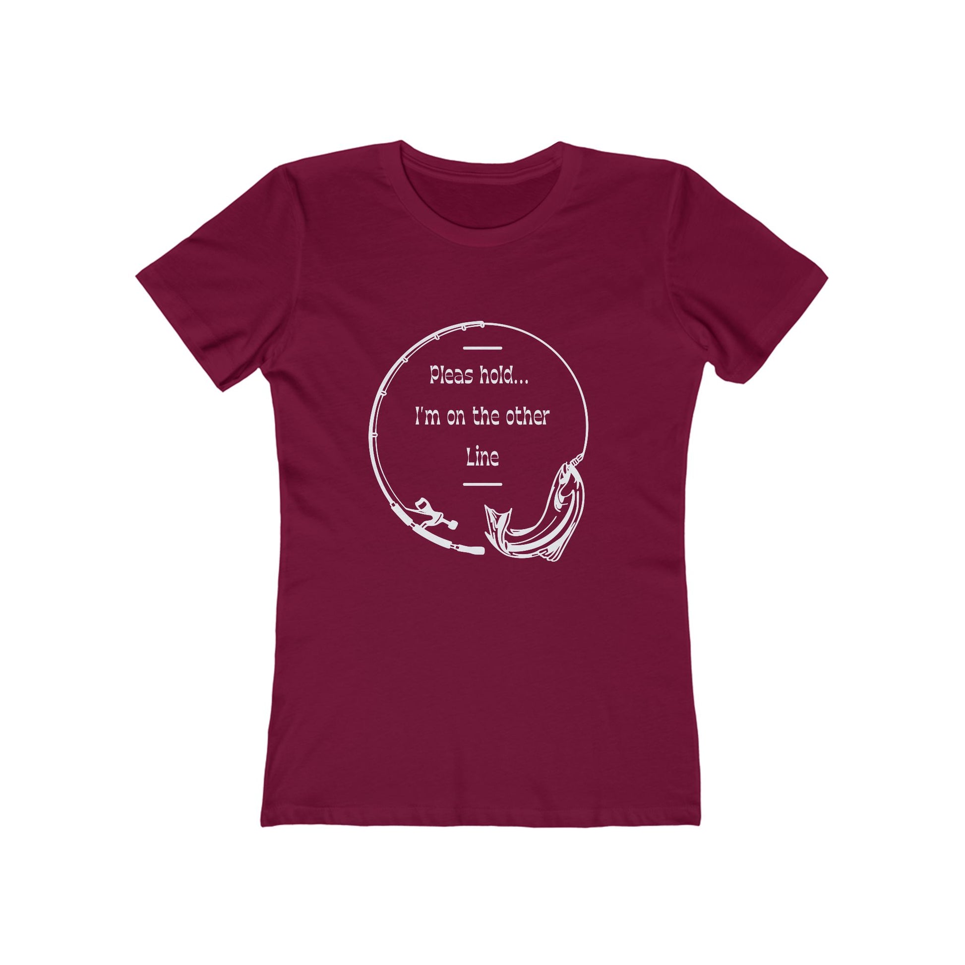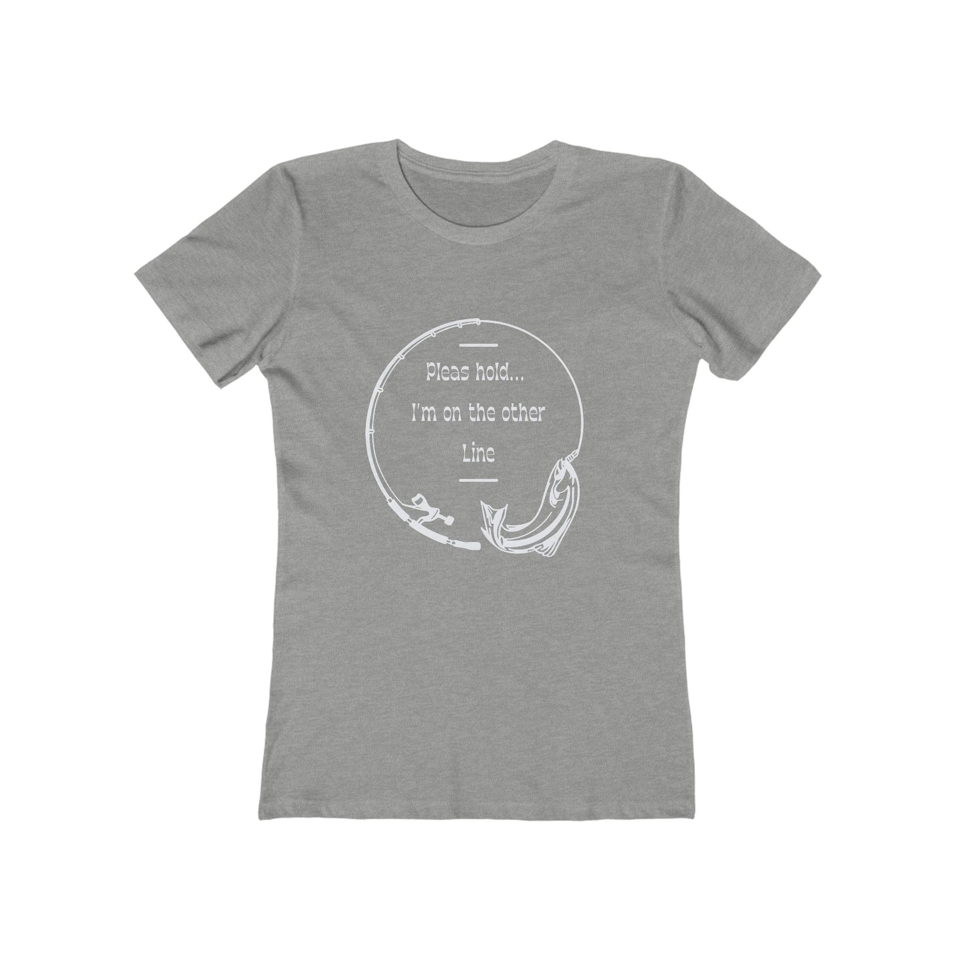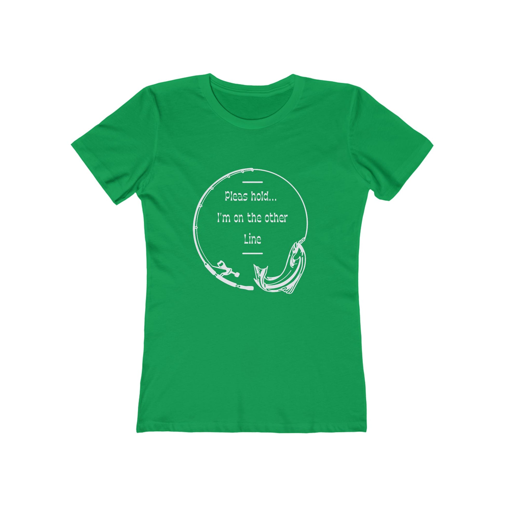 Featuring the clever quote "Please hold... I'm on the other line" alongside a fishing rod and fish graphic, this tee is perfect for anglers who love a good pun with their catch.