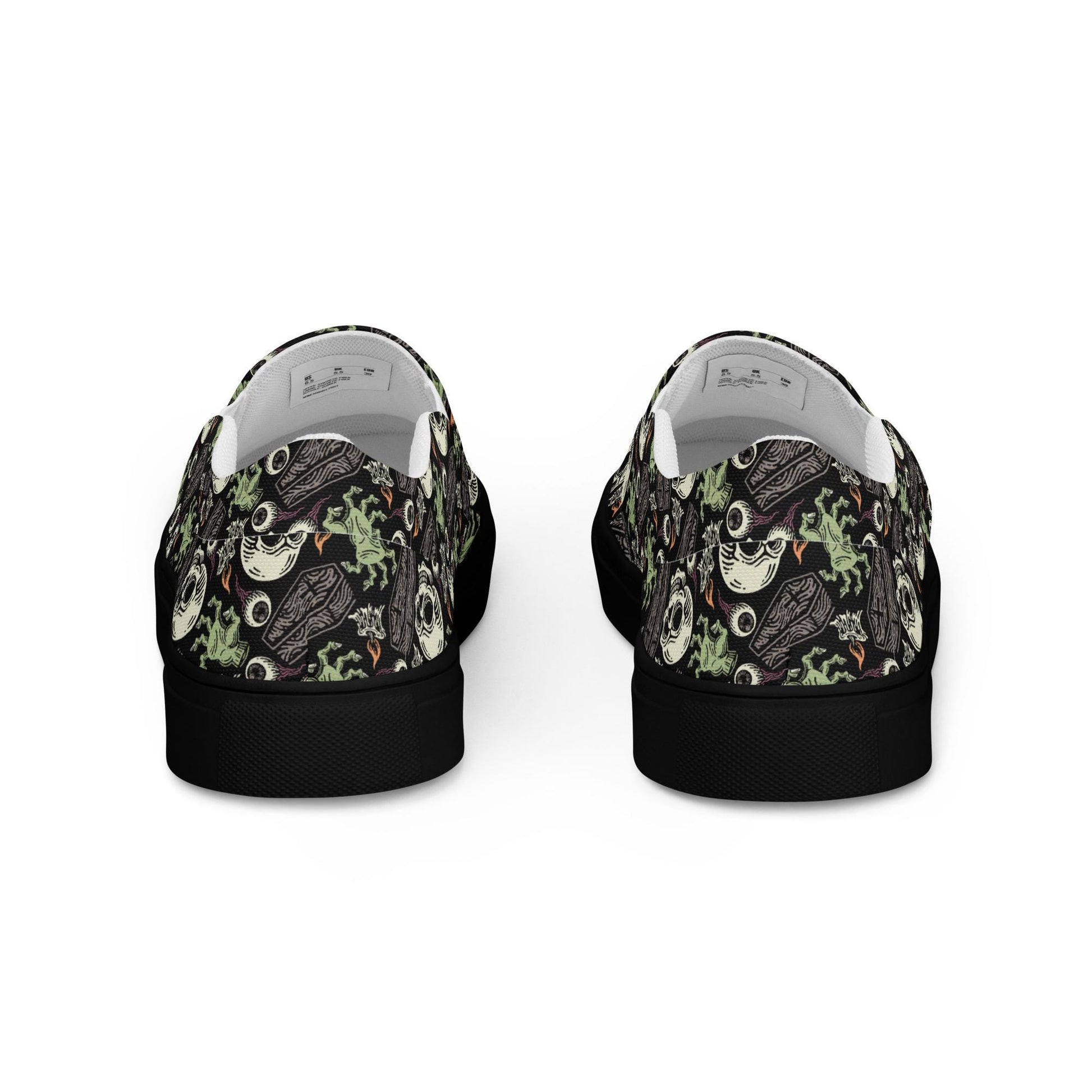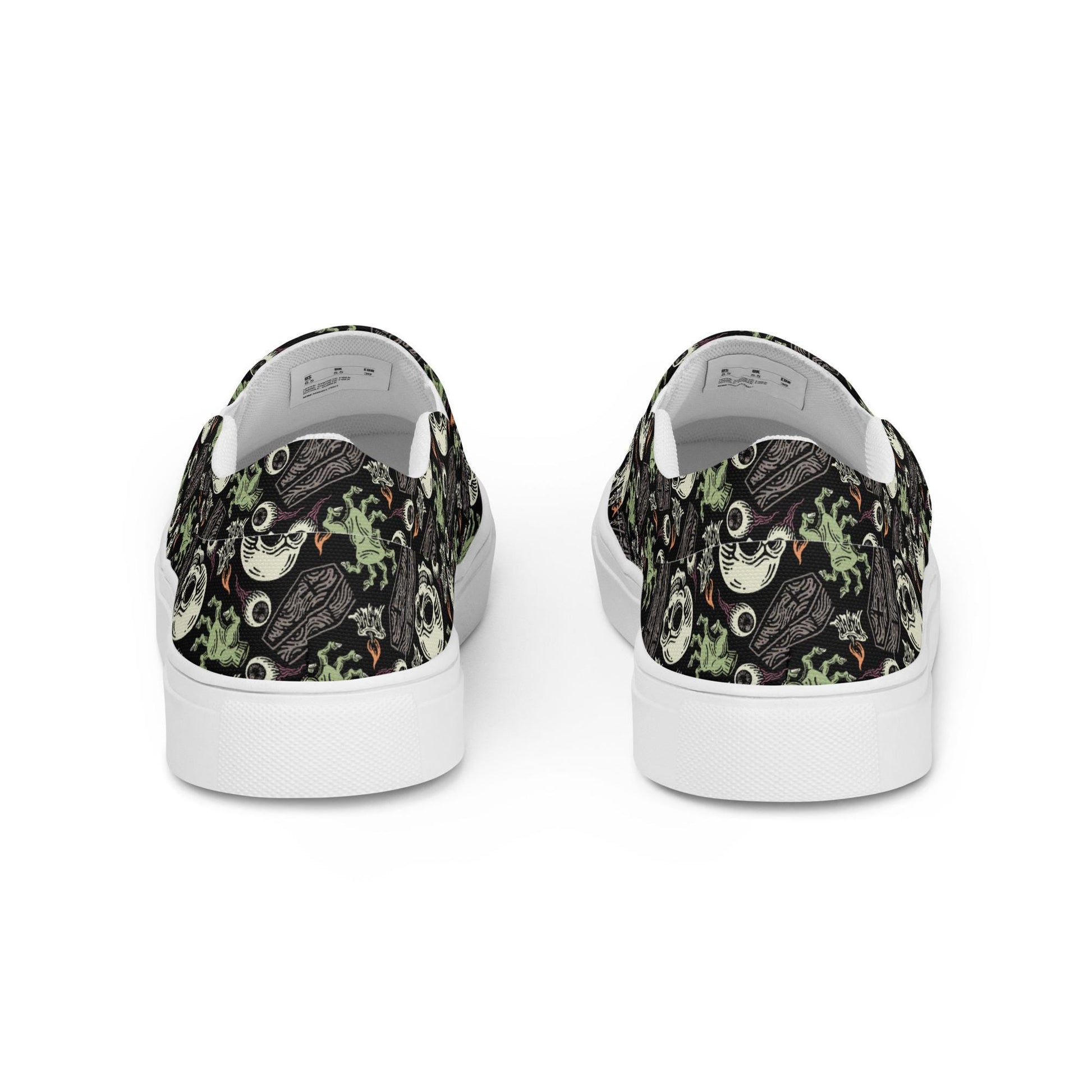 Step out in style and spooky flair with these Women's Halloween Slip-On Shoes with Spooky Skull Eyeball Pattern-your perfect seasonal footwear for a hauntingly fashionable look!